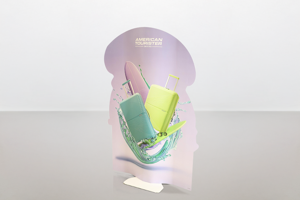 De display is tweezijdig bedrukt, waardoor deze perfect in een open ruimte geplaatst kan worden. Deze display is te bestellen vanaf 15 cm tot en met 190 cm hoog.
