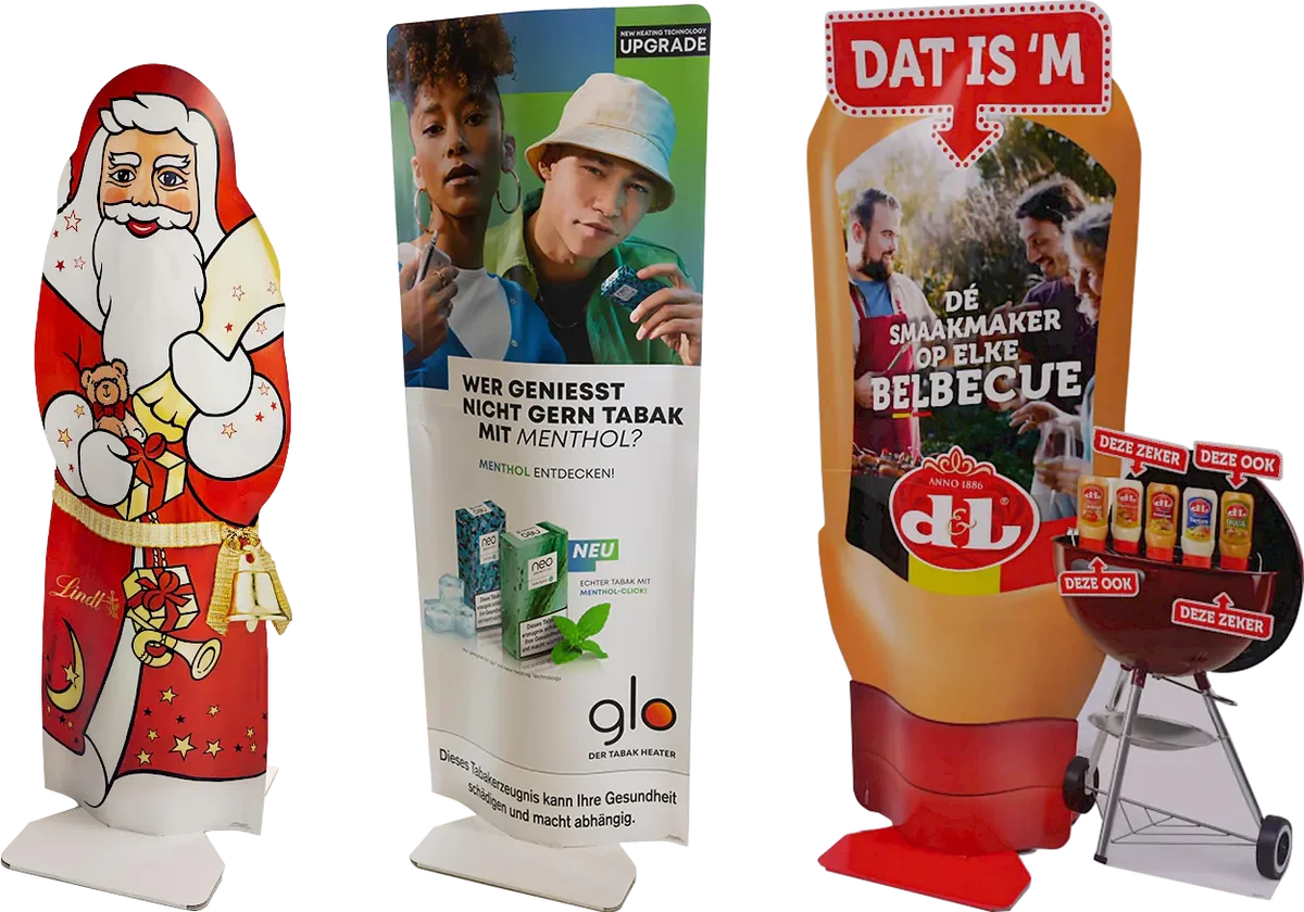 De display is tweezijdig bedrukt, waardoor deze perfect in een open ruimte geplaatst kan worden. Door de lichte bolling krijgt de display nog meer karakter. Deze display biedt vele creatieve mogelijkheden en is te bestellen vanaf 15 cm tot en met 190 cm hoog.